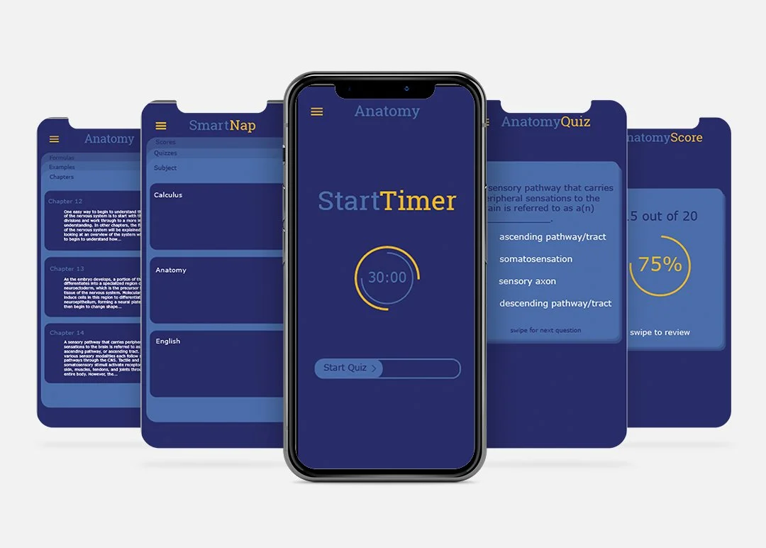 SmartNap is a mobile app designed to help students study. Research shows that taking a nap instead of continuing to study helps students better retain information. When a student needs a break, all they have to do is set the timer and take a nap. Once the timer goes off, the student is given a quiz to see how well they remembered what they just studied. I designed the branding and mockup for the app.